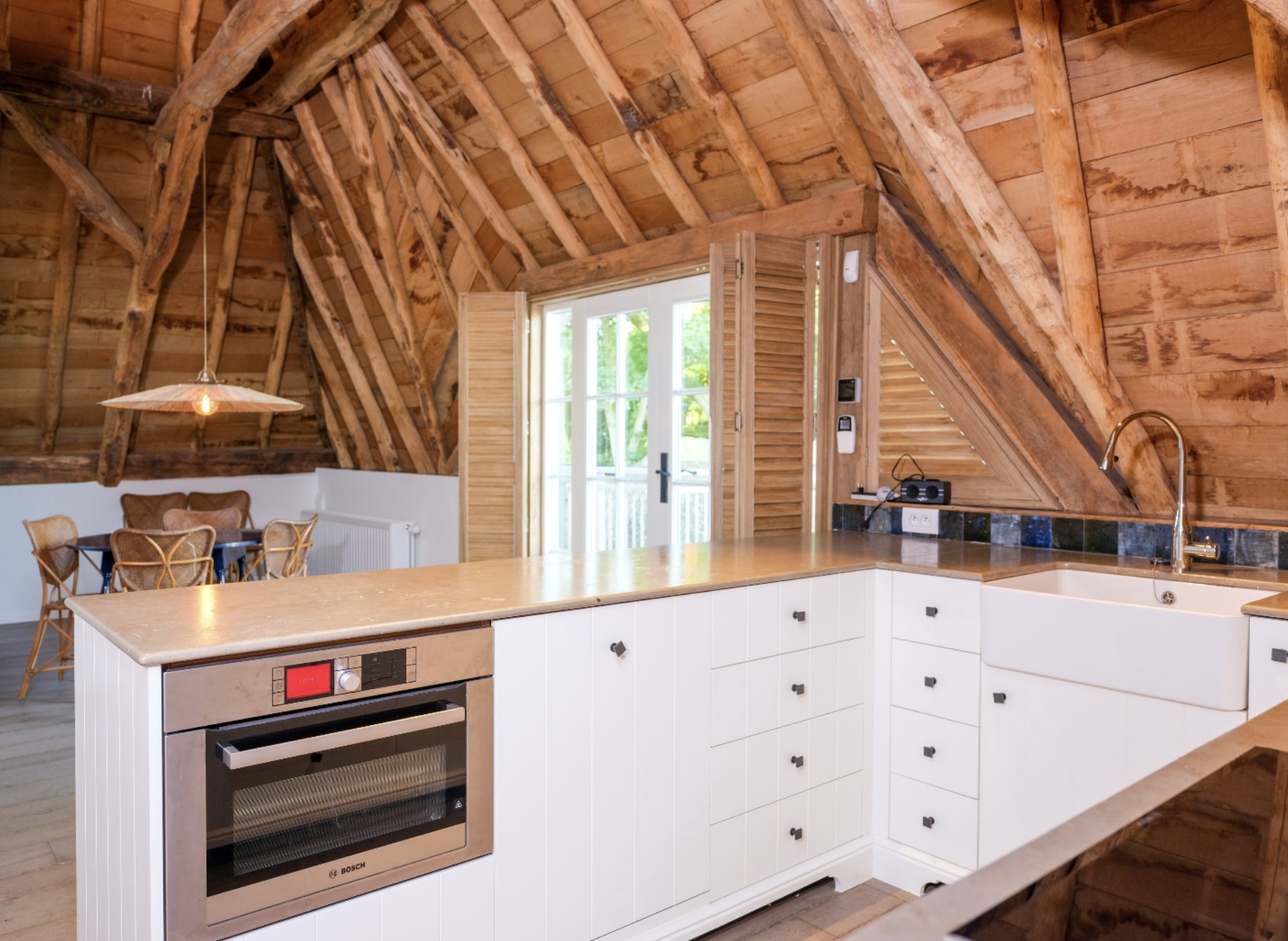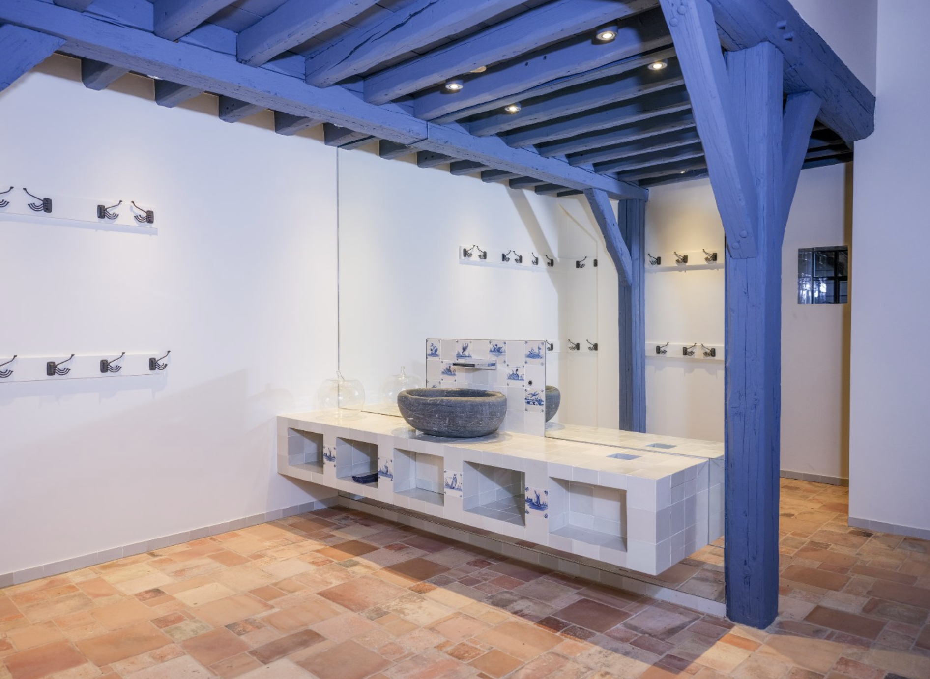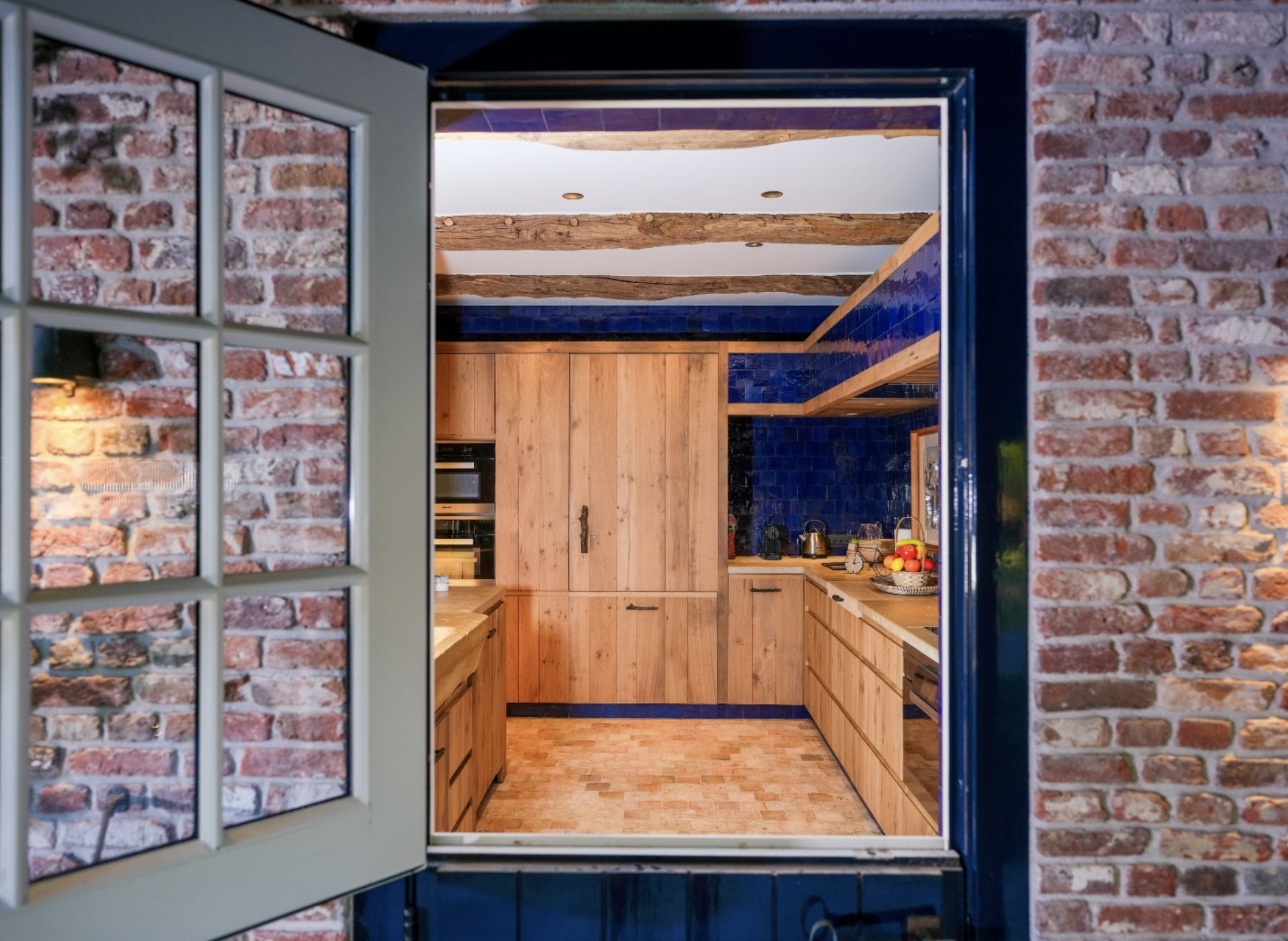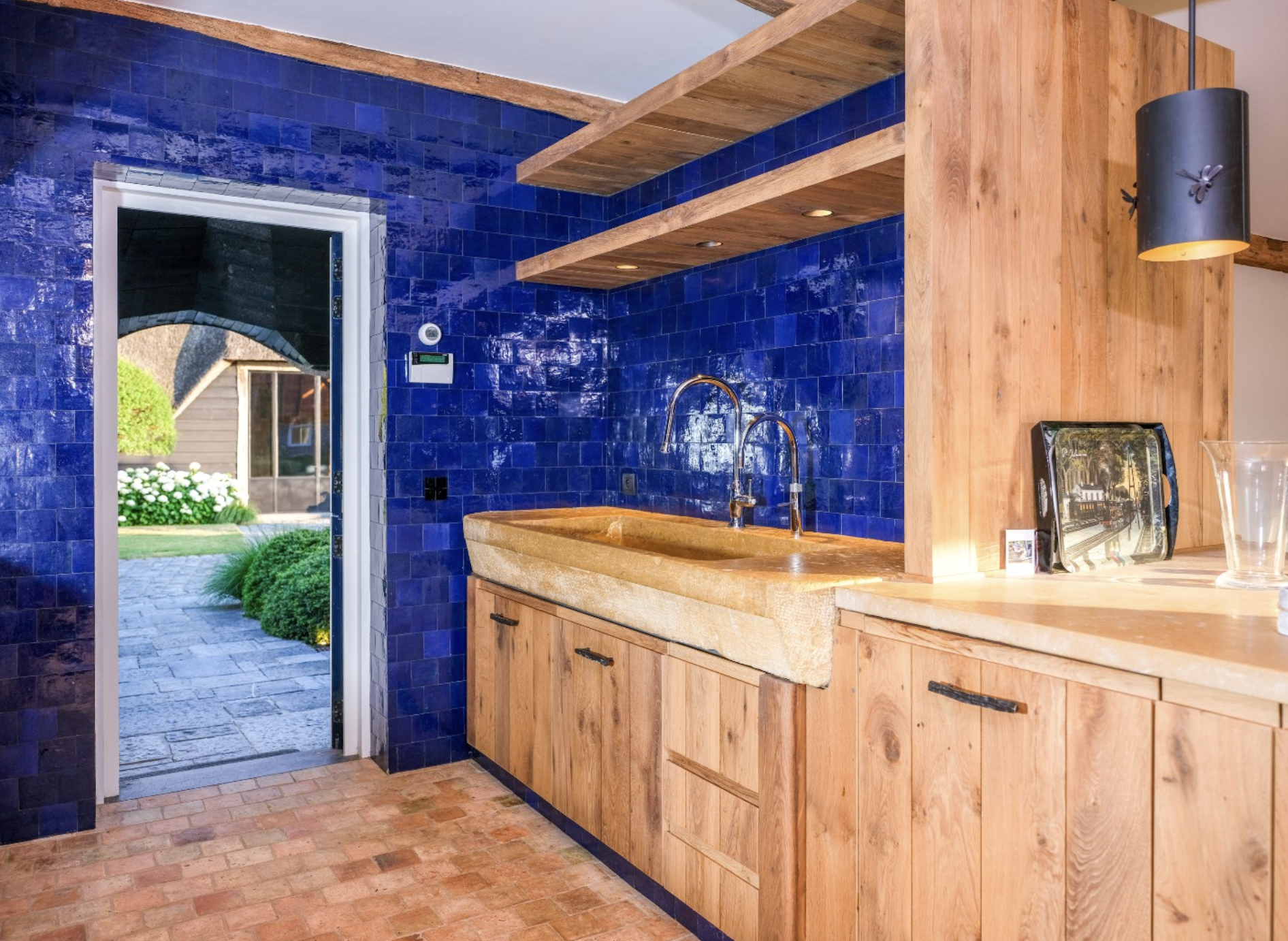 De keuken is dé blikvanger van het gebouw. De wanden zijn bekleed met diepblauwe, handgevormde tegels die door hun glanzende afwerking en subtiele kleurverschillen een levendig en bijna artistiek karakter krijgen. Ze vormen een krachtig decor voor de warme houten keukenkasten, uitgevoerd in rustiek hout met zichtbare nerftekening en noesten. Bijzonder is het werkblad in licht natuursteen, dat niet alleen praktisch is, maar ook esthetisch bijdraagt aan het ambachtelijke karakter van de ruimte. De massieve spoelbak, eveneens uit natuursteen gehouwen, benadrukt het gevoel van duurzaamheid en vakmanschap. Dit wordt versterkt door de terracottakleurige plavuizenvloeren, de zichtbare houten balken aan het plafond, die samen zorgen voor een warme, landelijke sfeer met een eigentijdse toets.