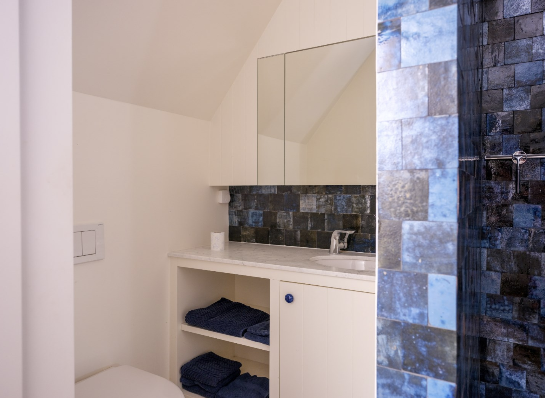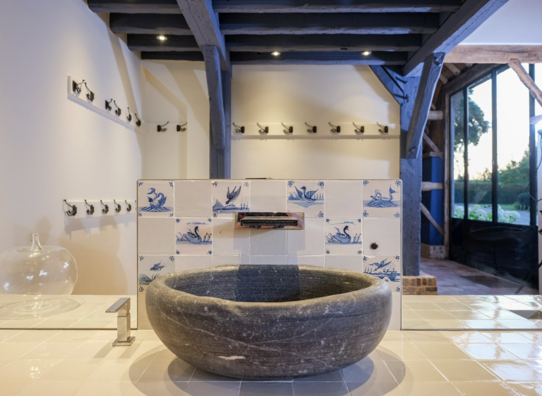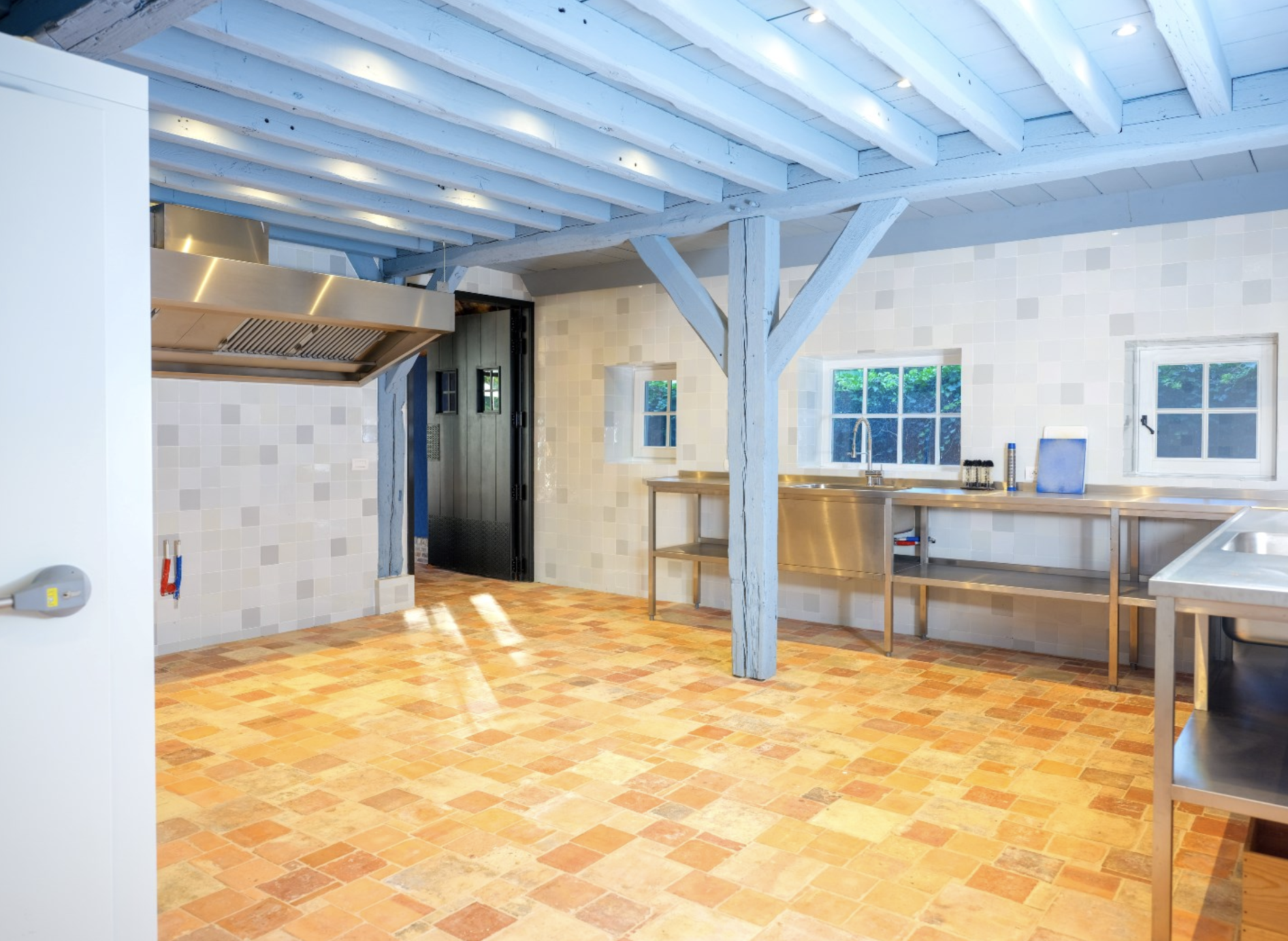De keuken is dé blikvanger van het gebouw. De wanden zijn bekleed met diepblauwe, handgevormde tegels die door hun glanzende afwerking en subtiele kleurverschillen een levendig en bijna artistiek karakter krijgen. Ze vormen een krachtig decor voor de warme houten keukenkasten, uitgevoerd in rustiek hout met zichtbare nerftekening en noesten. Bijzonder is het werkblad in licht natuursteen, dat niet alleen praktisch is, maar ook esthetisch bijdraagt aan het ambachtelijke karakter van de ruimte. De massieve spoelbak, eveneens uit natuursteen gehouwen, benadrukt het gevoel van duurzaamheid en vakmanschap. Dit wordt versterkt door de terracottakleurige plavuizenvloeren, de zichtbare houten balken aan het plafond, die samen zorgen voor een warme, landelijke sfeer met een eigentijdse toets.