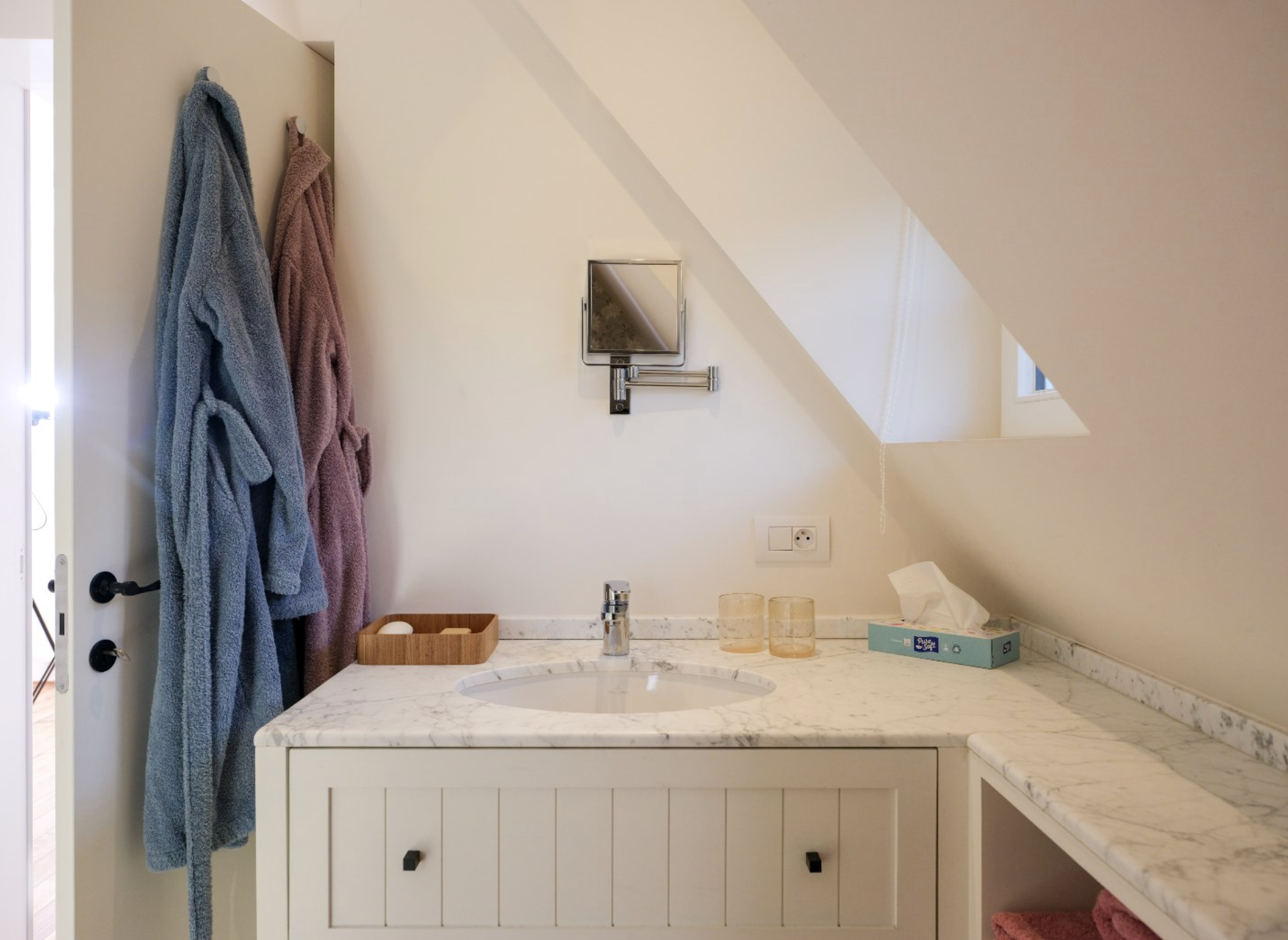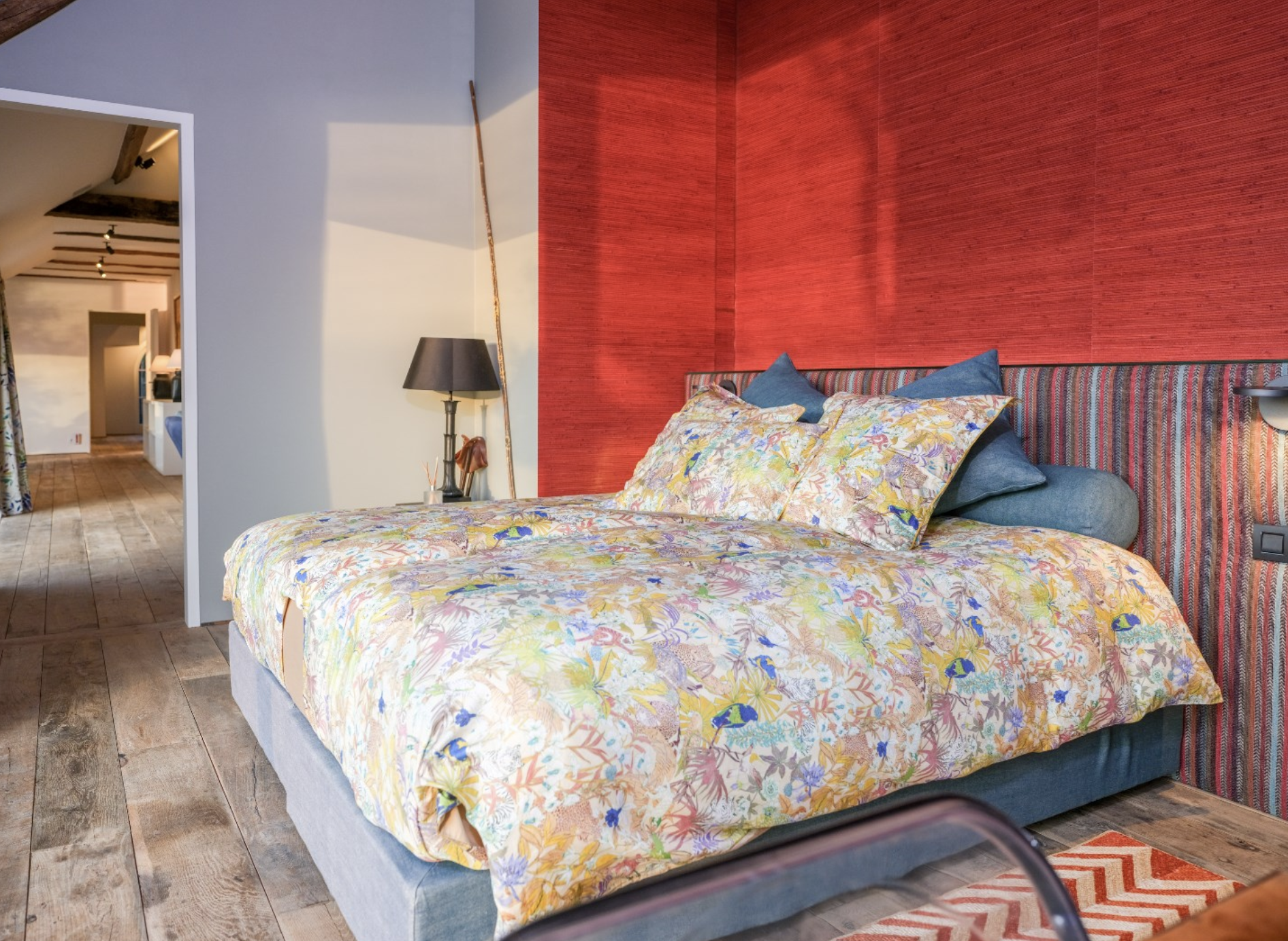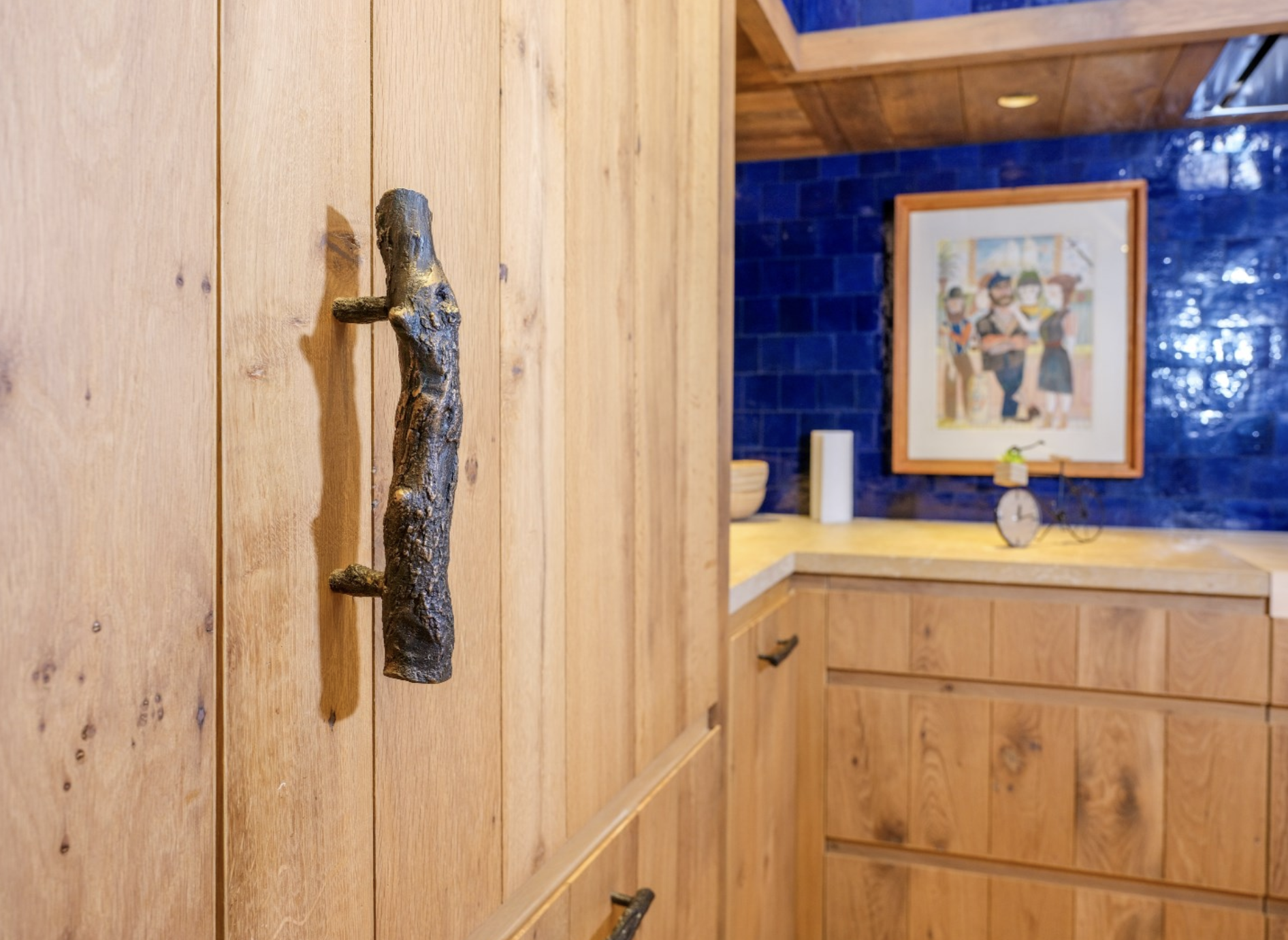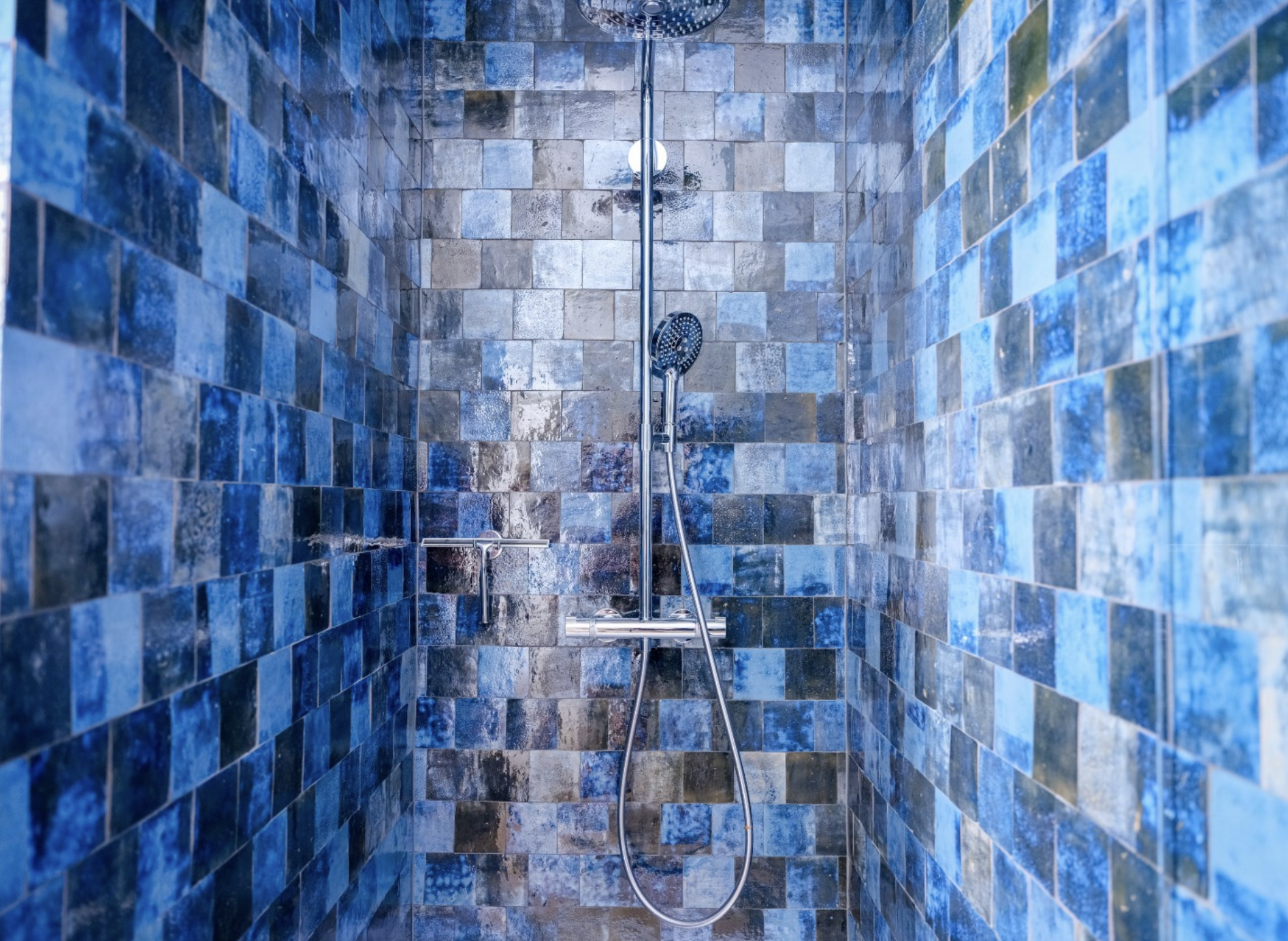 De keuken is dé blikvanger van het gebouw. De wanden zijn bekleed met diepblauwe, handgevormde tegels die door hun glanzende afwerking en subtiele kleurverschillen een levendig en bijna artistiek karakter krijgen. Ze vormen een krachtig decor voor de warme houten keukenkasten, uitgevoerd in rustiek hout met zichtbare nerftekening en noesten. Bijzonder is het werkblad in licht natuursteen, dat niet alleen praktisch is, maar ook esthetisch bijdraagt aan het ambachtelijke karakter van de ruimte. De massieve spoelbak, eveneens uit natuursteen gehouwen, benadrukt het gevoel van duurzaamheid en vakmanschap. Dit wordt versterkt door de terracottakleurige plavuizenvloeren, de zichtbare houten balken aan het plafond, die samen zorgen voor een warme, landelijke sfeer met een eigentijdse toets.