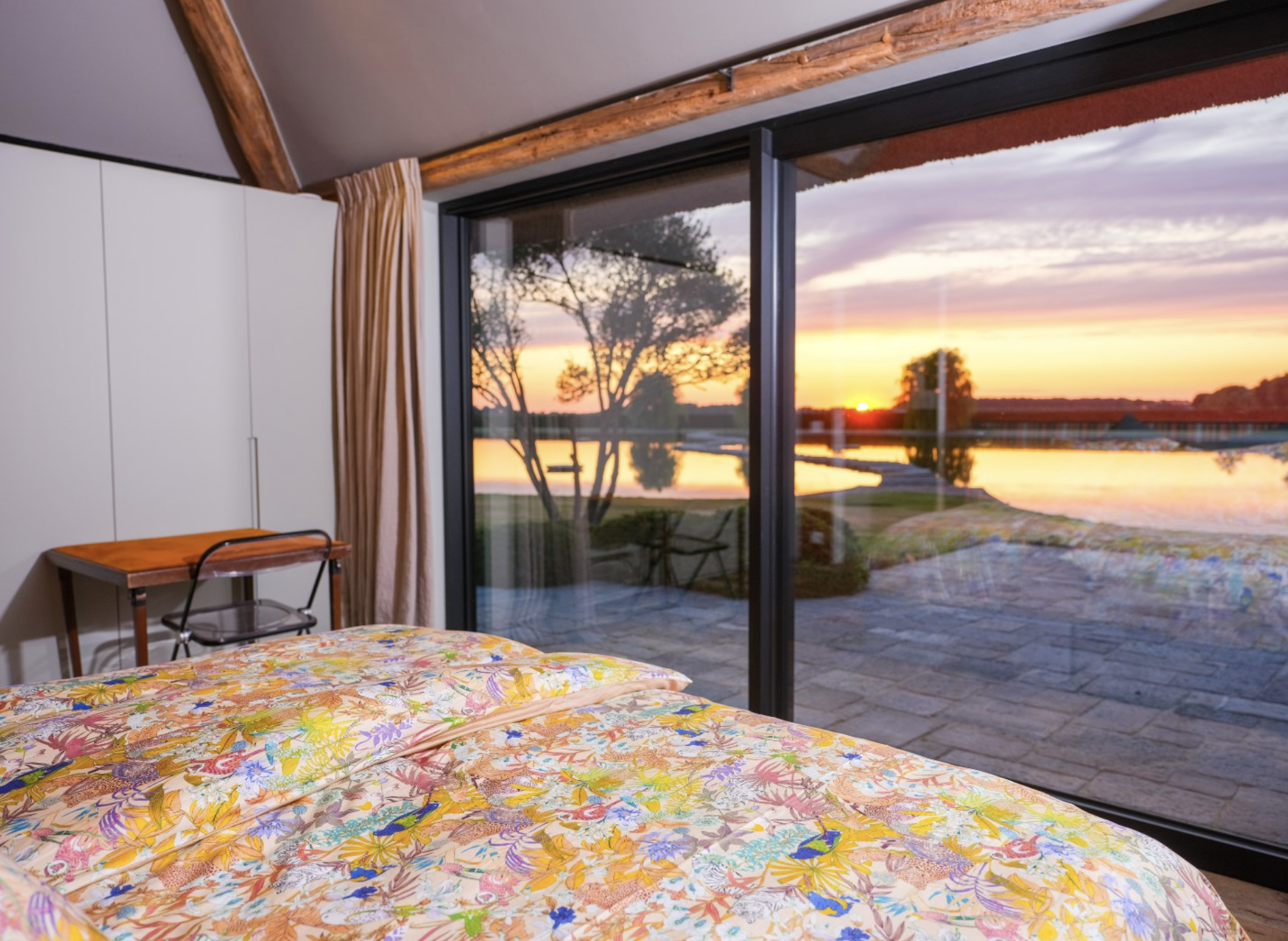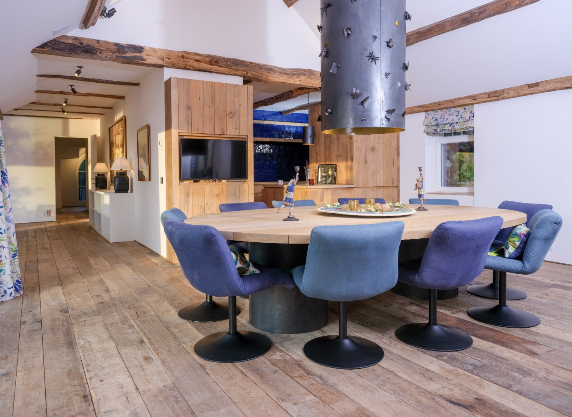 Naadloos vloeit de keuken over in de ruime eetkamer, waar hetzelfde gevoel van natuurlijkheid en vakmanschap voortleeft. De houten vloer met brede, doorleefde planken verbindt de twee ruimtes visueel en inhoudelijk. Centraal staat een imposante, ovale eettafel van massief hout, rustend op een zwarte sokkel. Een echte eyecatcher is de grote, cilindervormige lamp boven de tafel, uitgevoerd in zwart met een goudkleurige binnenzijde en speelse insectendecoraties – een subtiel kunstobject dat de ruimte karakter geeft zonder te overheersen. Dankzij de grote glazen schuifpuien baadt de ruimte in natuurlijk licht en wordt het buitenleven een vanzelfsprekend onderdeel van het interieur. Het uitzicht op het water en de omliggende tuin zorgt voor rust, ruimte en een gevoel van vrijheid.