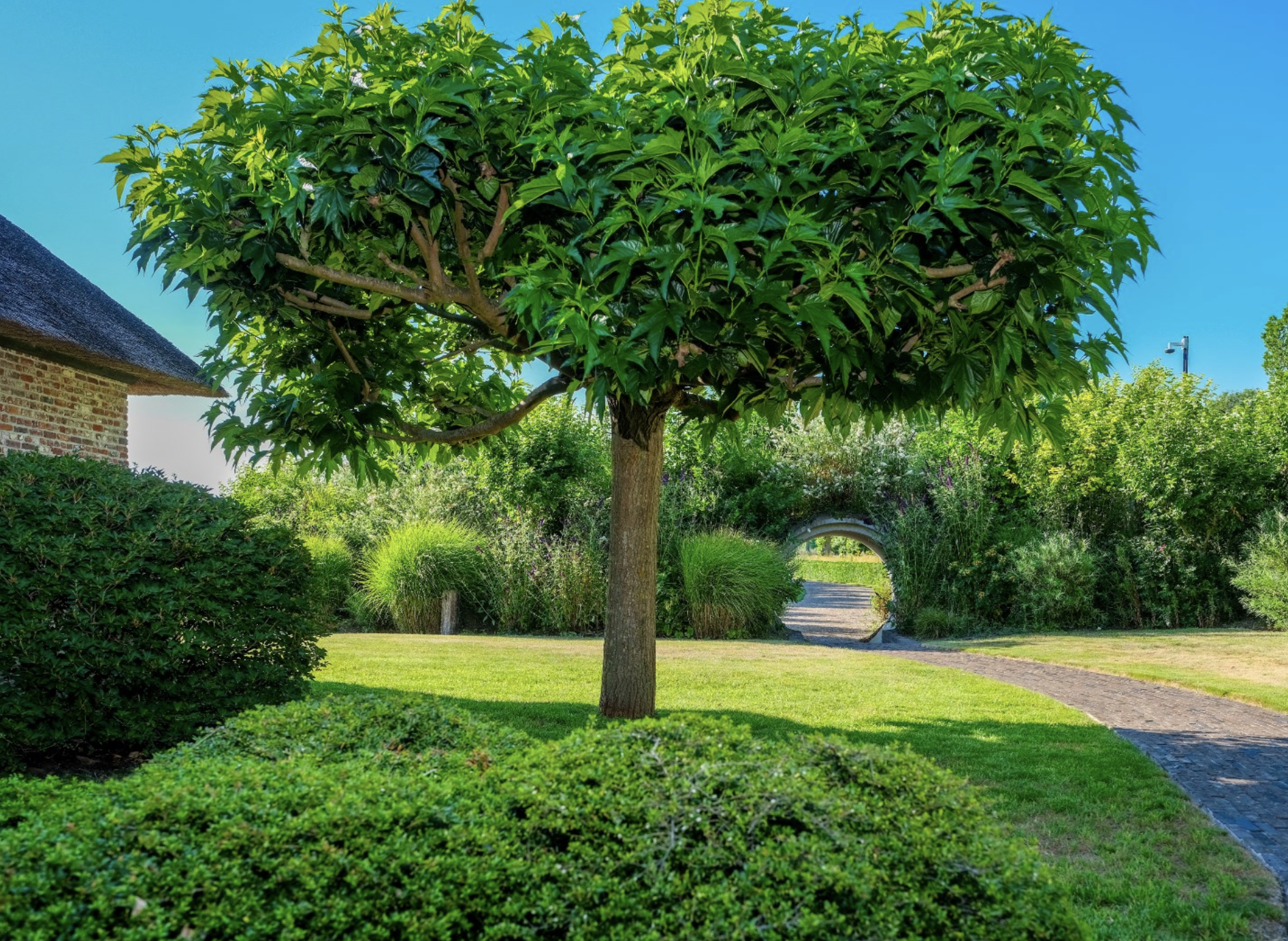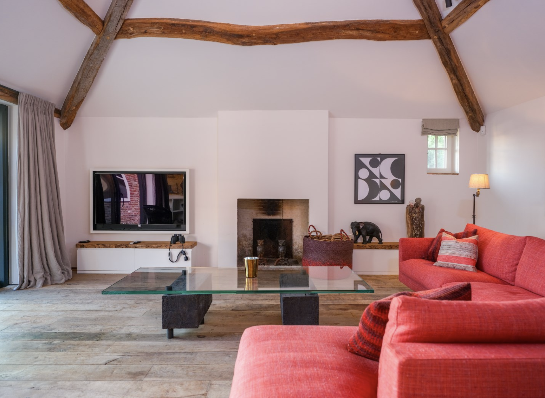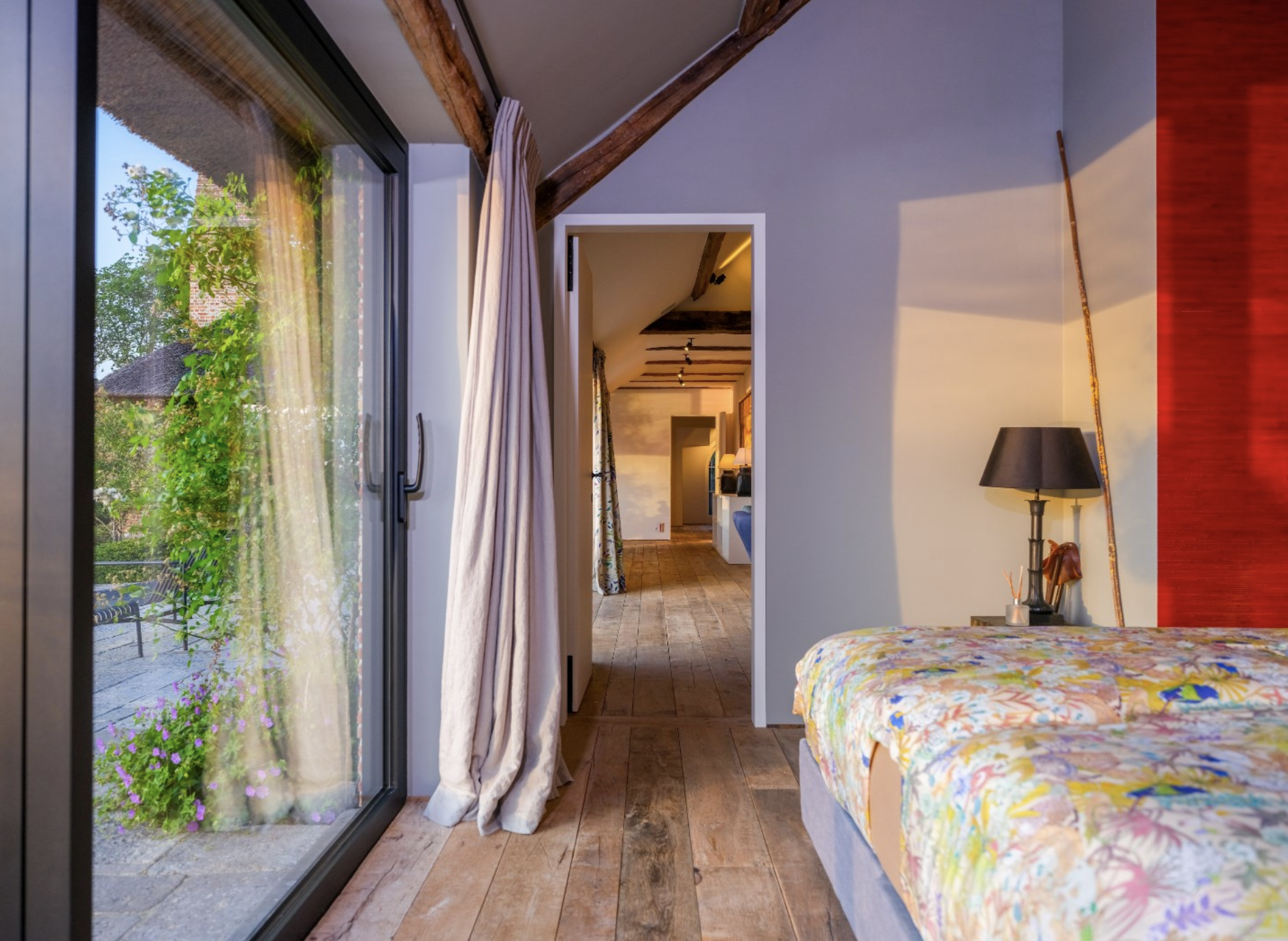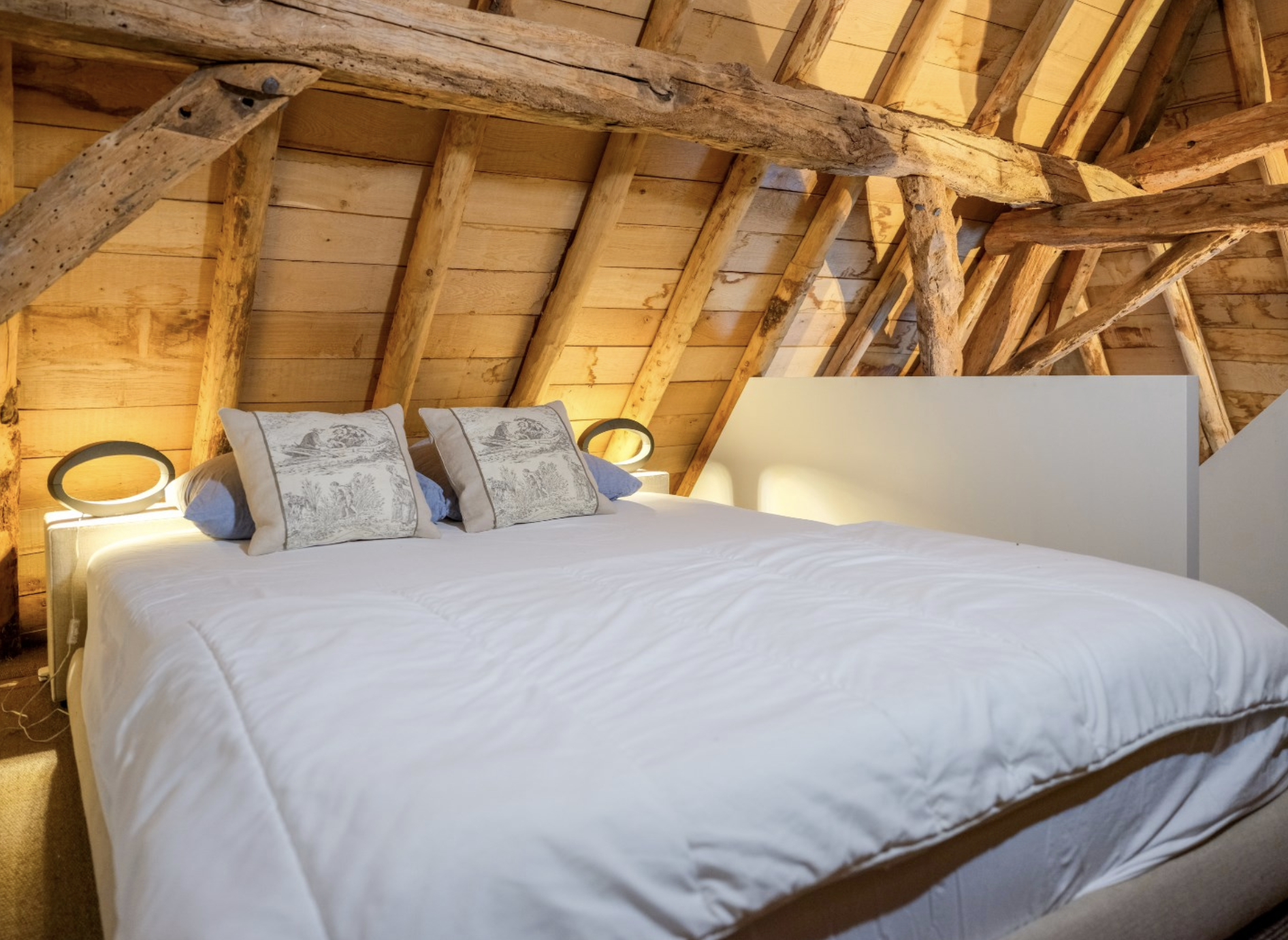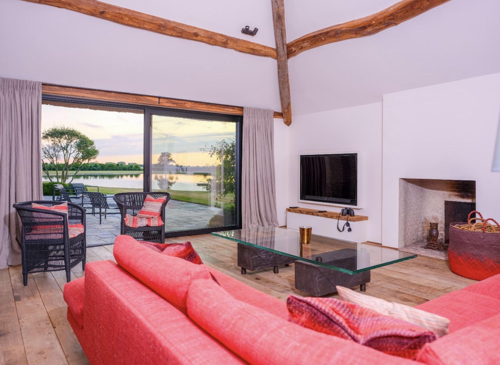 De Landzaal vormt een indrukwekkend onderdeel van het domein – een voormalig agrarisch bijgebouw dat met respect voor zijn geschiedenis en met gevoel voor stijl is getransformeerd tot een multifunctionele ruimte van uitzonderlijke klasse. Wat ooit een authentieke schuur was, is nu een karaktervolle plek waar het verleden en heden harmonieus samenvloeien. De grote open ruimte wordt gekenmerkt door het prachtige houten spantwerk dat nog volledig in het zicht is gelaten. De zware eiken balken, met hun oorspronkelijke ambachtelijke verbindingen, dragen het imposante dak en geven de ruimte zijn unieke sfeer en historische waarde. Het dak zelf is eveneens met oog voor detail gerestaureerd en vormt samen met de warmrode gebakken vloertegels een robuuste, natuurlijke basis. Deze materialen ademen authenticiteit en creëren een warme, uitnodigende ambiance. In deze ruimte komen rustieke elementen en moderne comfortvoorzieningen naadloos samen. De Landzaal is voorzien van vloerverwarming, sfeervolle verlichting en grote raampartijen die uitzicht bieden op het omliggende groen en het water, terwijl een monumentale schouw met open haard het geheel extra cachet geeft. De ruimte is flexibel inzetbaar: voor diners, ontvangsten, workshops of intieme vieringen.