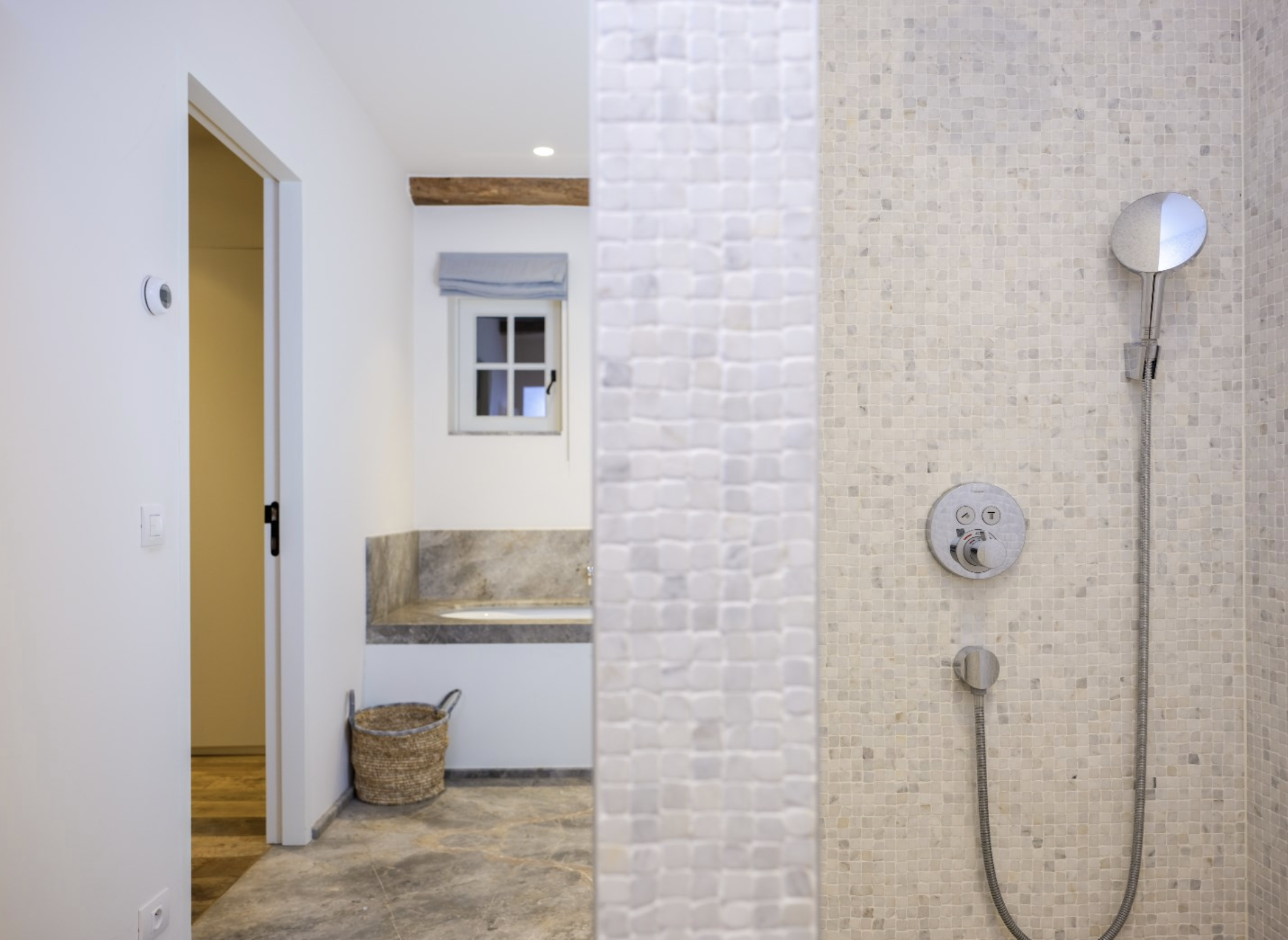 Aansluitend aan het zwembad bevindt zich een discrete en stijlvol uitgevoerde doucheruimte, afgewerkt in lichte tegels met een strakke inloopdouche en moderne regendouchekop. Daarnaast is er een eigen toiletruimte aanwezig, zodat gasten of bewoners in volledige rust en zonder de ruimte te verlaten gebruik kunnen maken van alle sanitaire voorzieningen.