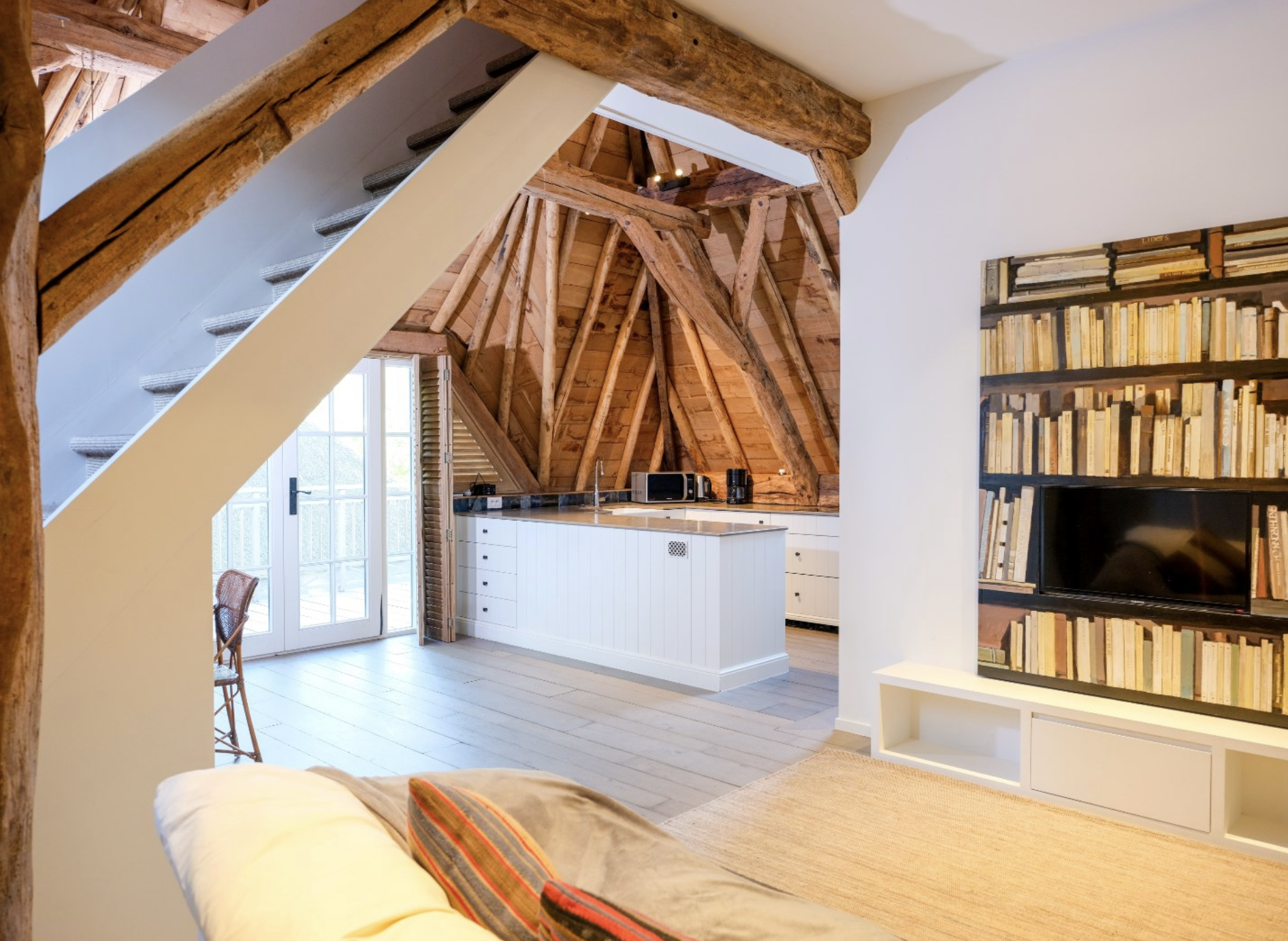 De grote riet gedekte schuur beschikt ook nog over een separate loft met balkon welke zicht heeft over het grote meer. De ruimte is volledig uitgerust met woning, eigen keuken, badkamer en slaapvertrek.
